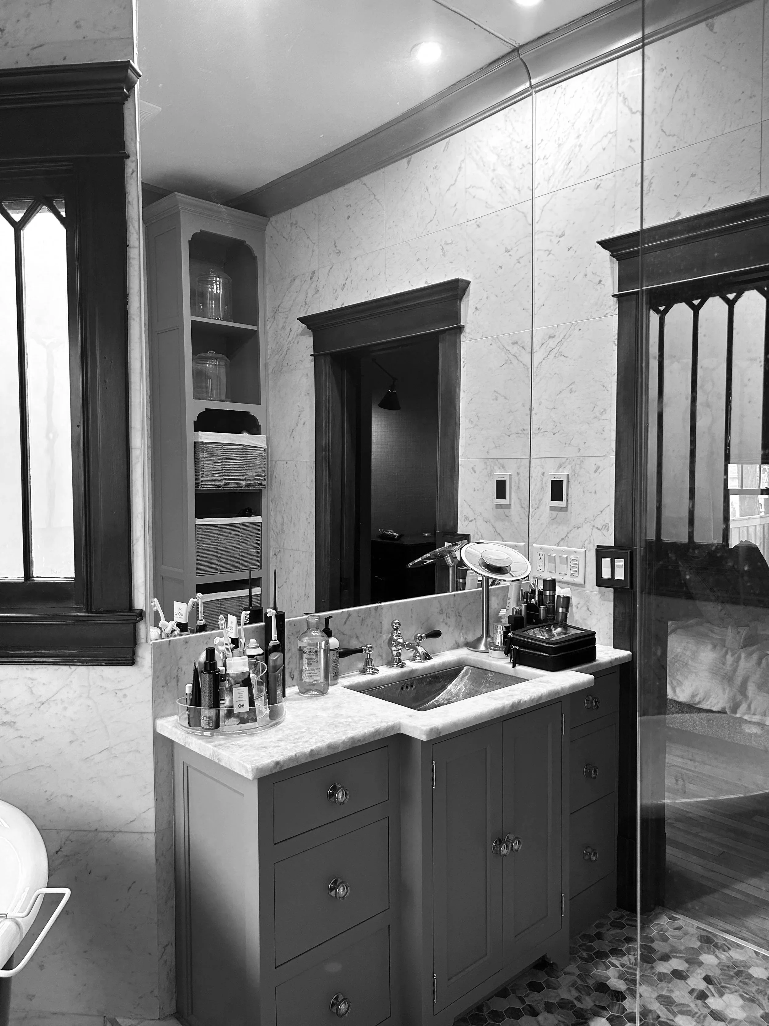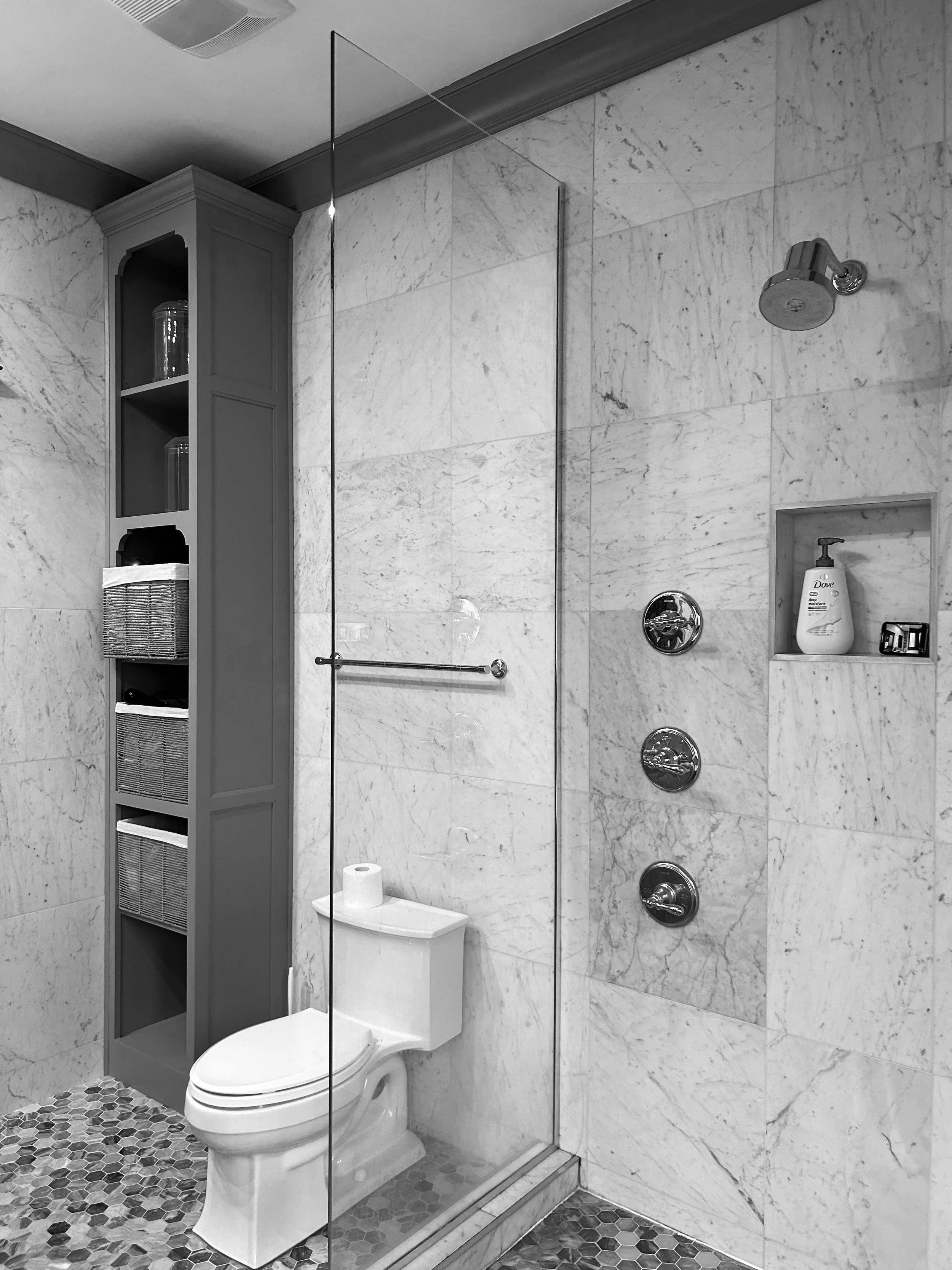 When serious water damage and structural issues were discovered in their primary bath, these homeowners jumped into a challenging remodeling project with both feet. They had inherited a pretty-on-the-outside bathroom that didn’t function well, and additionally, everything from the structural components to fixtures and finishes needed to be reconsidered and replaced. It became a perfect opportunity to rethink the function, refine the layout and create a space that was a reflection of their unique personal style. Dark, moody blacks and burgundy paired with Calacatta Viola Marble and antique brass create a sophisticated palette that is both dramatic and serene. His-and-Hers custom floating vanities drastically improve daily function. Replacing the seldom-used soaking tub with a luxe shower system makes better use of the limited square footage. New tall cabinetry adds plenty of hidden storage, and the sleek aesthetic is layered with details that speak to the original architecture of the home. A true design collaboration and a labor of love for the homeowners, this beautiful space can now serve as a sanctuary for many years to come.