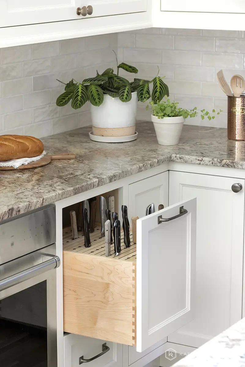 This elegant kitchen combines timeless architecture with tailored detailing. A soft neutral palette sets the tone, while the marble surfaces and warm wood accents bring depth and refinement.