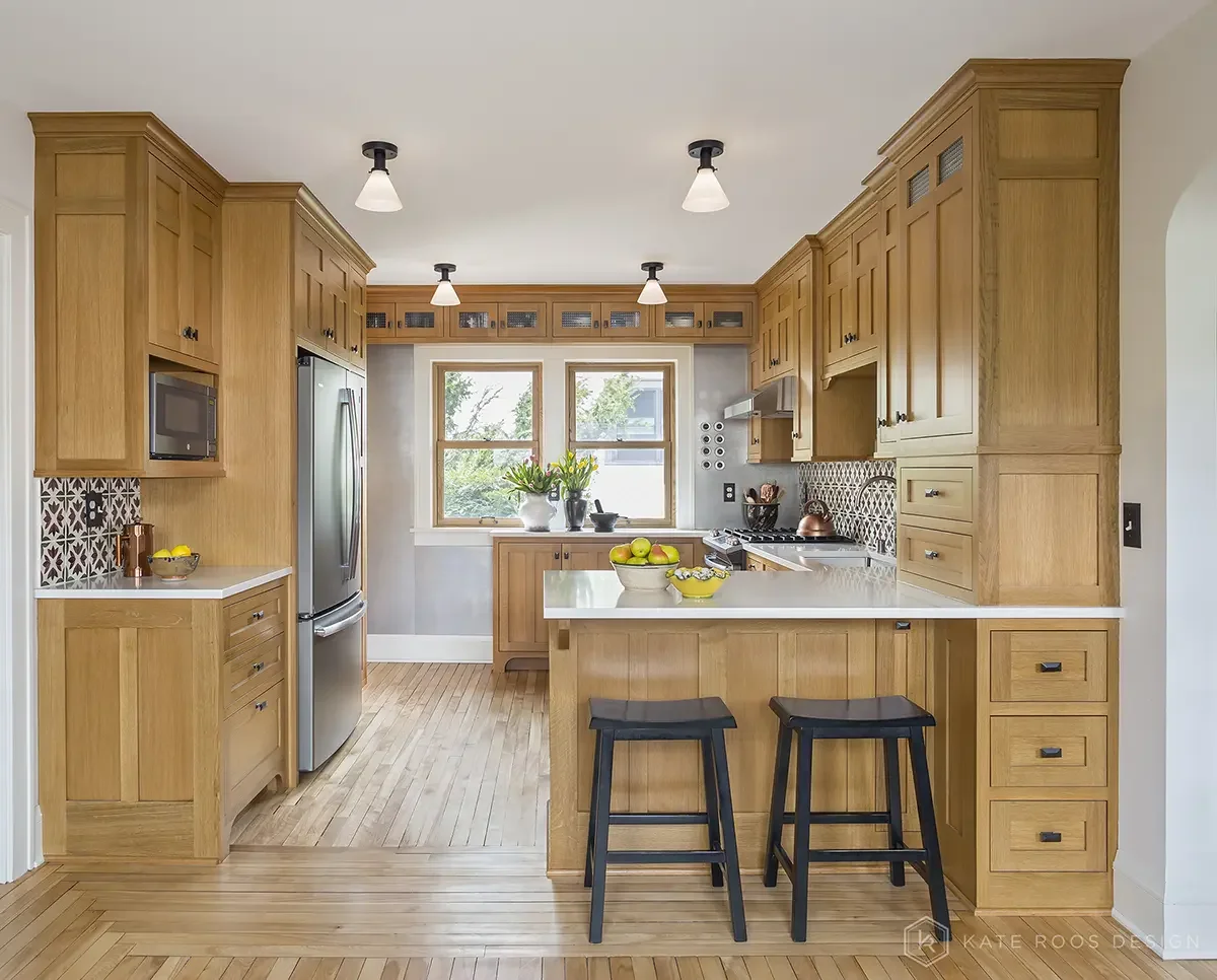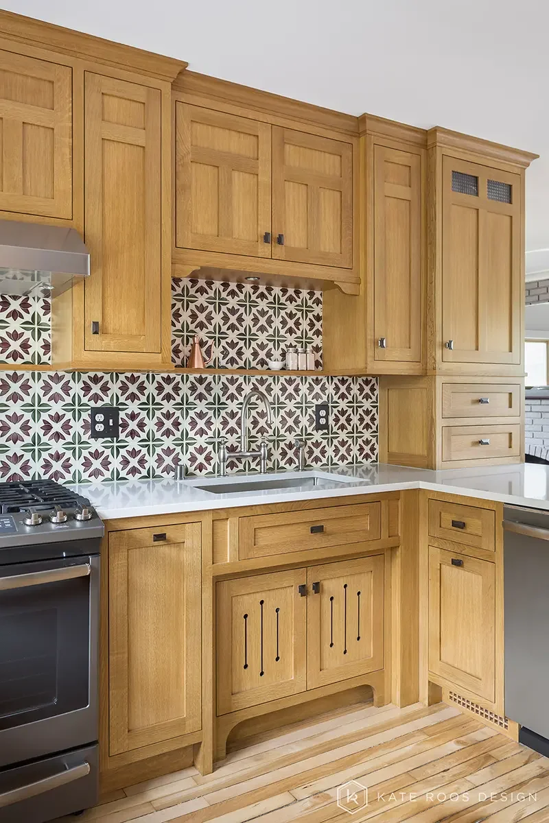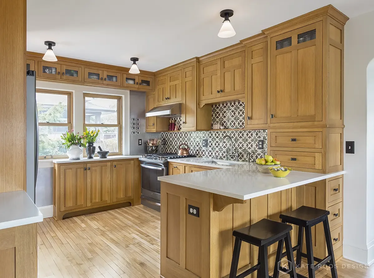 The quarter sawn white oak cabinetry has craftsman detail from the sink cut-outs to the mulled doors and drawers. The resulting space allows for a more functional space that fits the home perfectly.