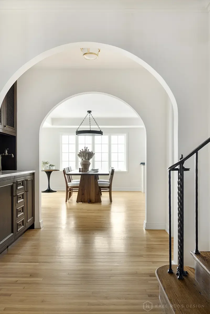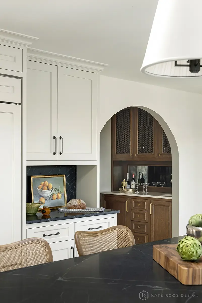The now bright, open kitchen and dining room space also incorporates a wet bar, butler’s pantry, drop zone area, and mudroom bench into the existing footprint for added flow and function. This relaxed yet polished space will serve this family well for years to come.