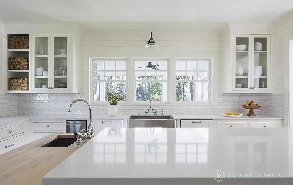 A lower prep sink cabinet, located on the end of the island with a butcher block top, keeps the island sight lines uninterrupted and also hides some of the prep mess. The fresh white color palette feels cheerful and sunny and modern, achieving a modern, farmhouse aesthetic.