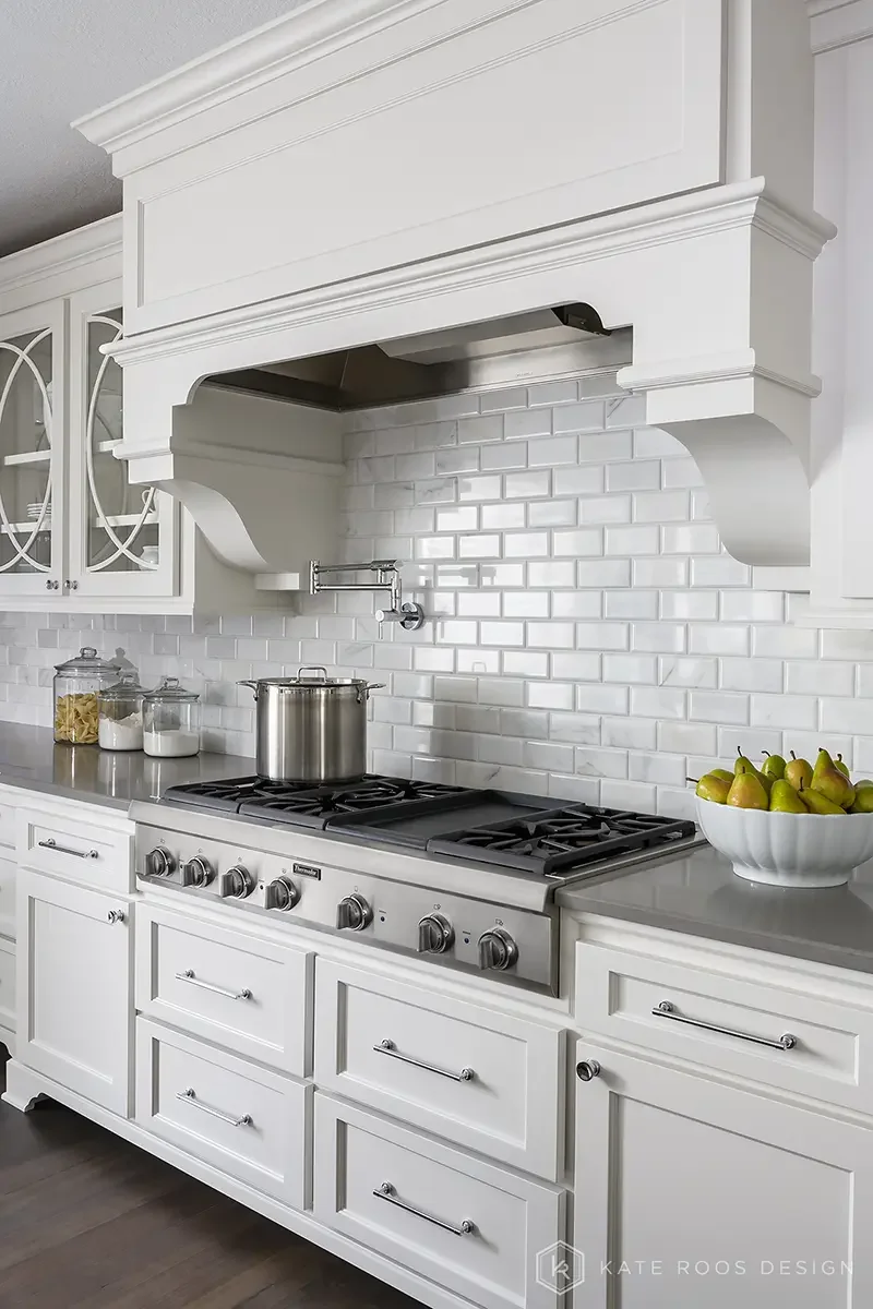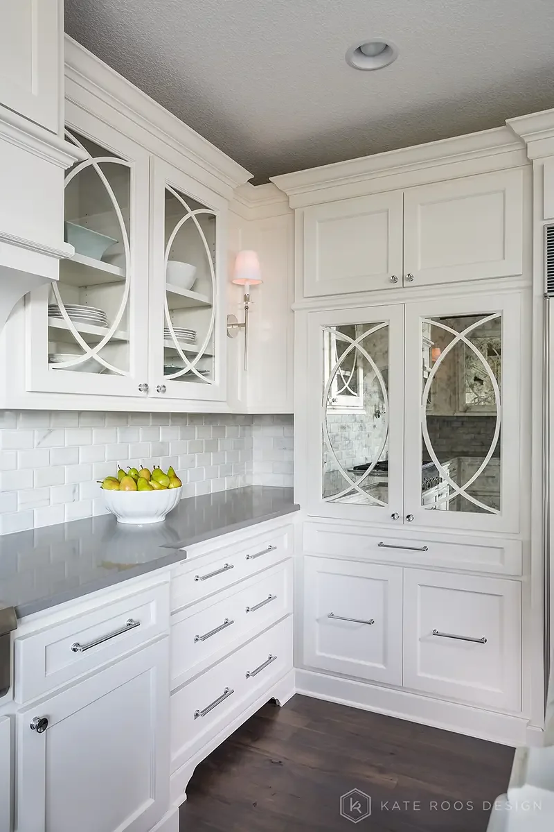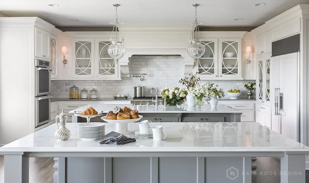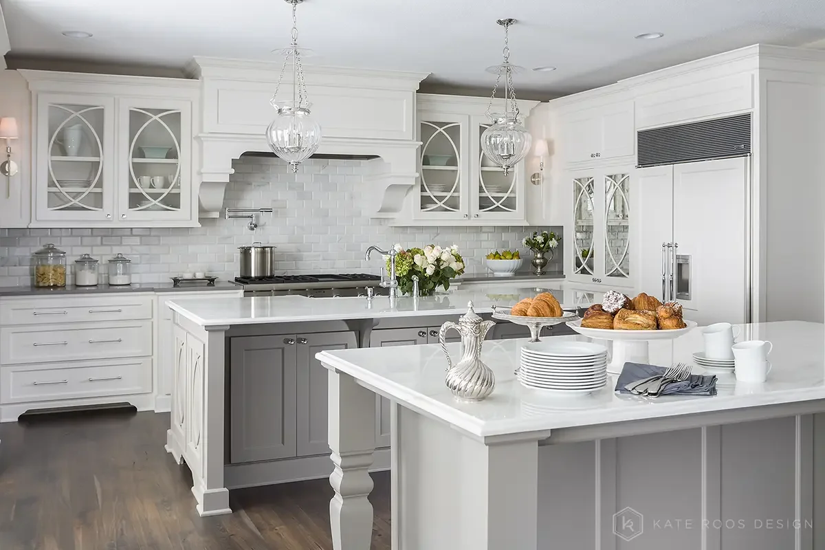 Painting the cabinetry in classic white with gray painted islands, marble and quartz countertops, and marble subway tile backslash creates a current and timeless appeal. Glass display cabinetry with polished nickel sconces on each side add an unexpected design element. The unique design details and fresh colors in this elegant kitchen create the timeless look the clients desired.