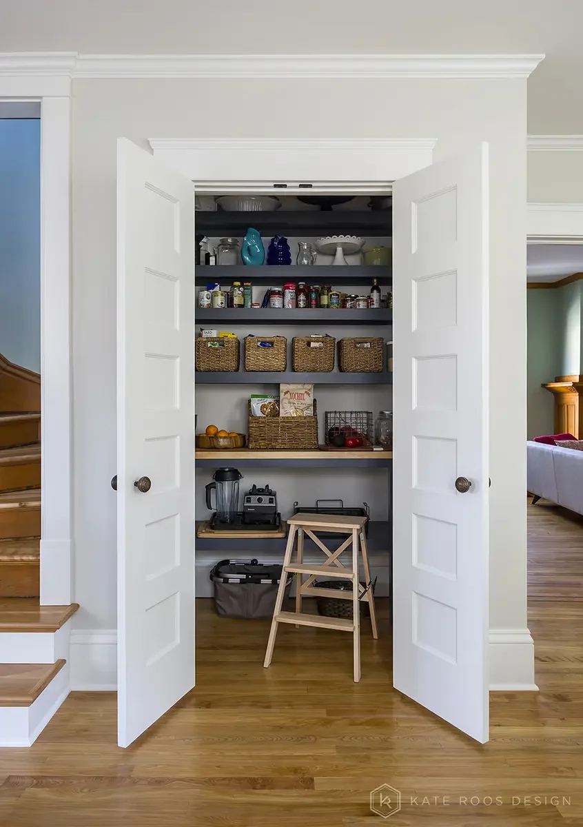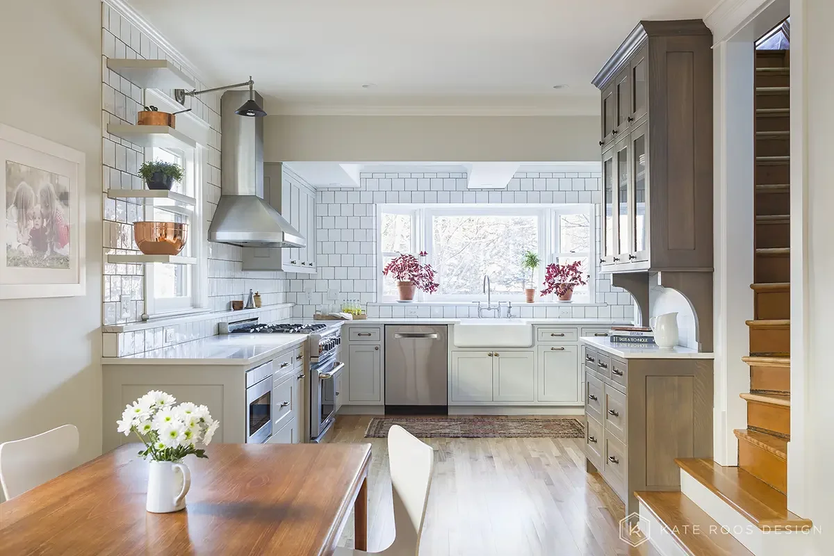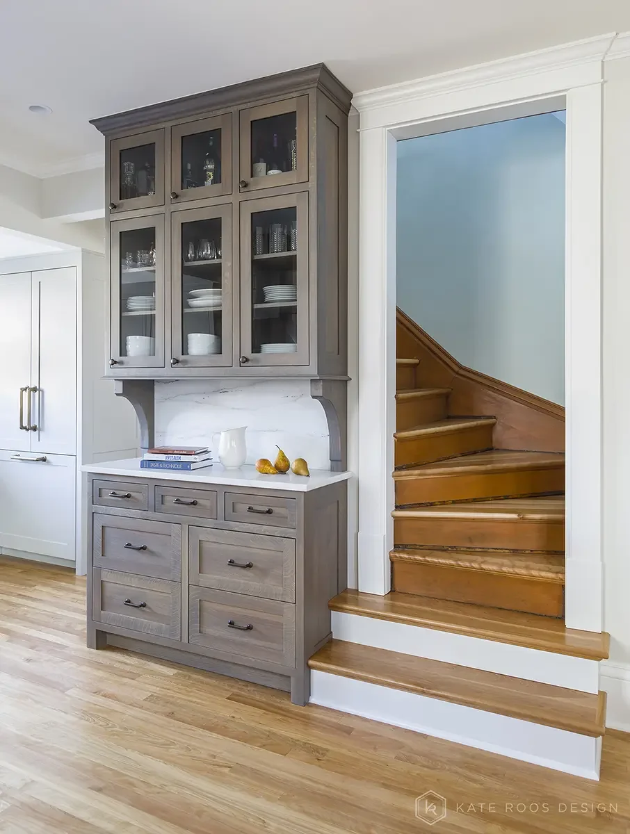 To work around a stairwell that enters directly into the kitchen the door was taken off, making it more easily accessible, and a drop zone was created at the same depth as the steps to add interest. The resulting design is inviting and airy and compliments the home’s Victorian details.
